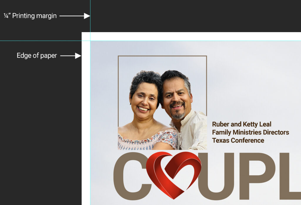 No printer is capable of printing all the way to the edge of a page. This “unprintable” area is usually referred to as the “printing margin.” (Not to be confused with a “design margin”) The easiest and most cost-effective way to design a poster is to create your layout with a ¼” white margin on all sides. For example, if you are creating a poster that is to be printed on standard 8½” x 11” paper, the inclusion of a ¼” printing margin on all sides means your actual printing area will only be 8” x 10½”.